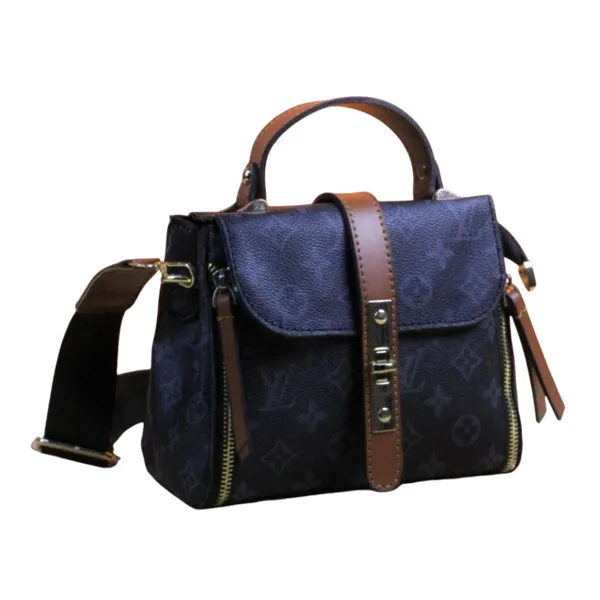 with 3 compartments and an inner pocket with a crossbody strap and gold accessories.
